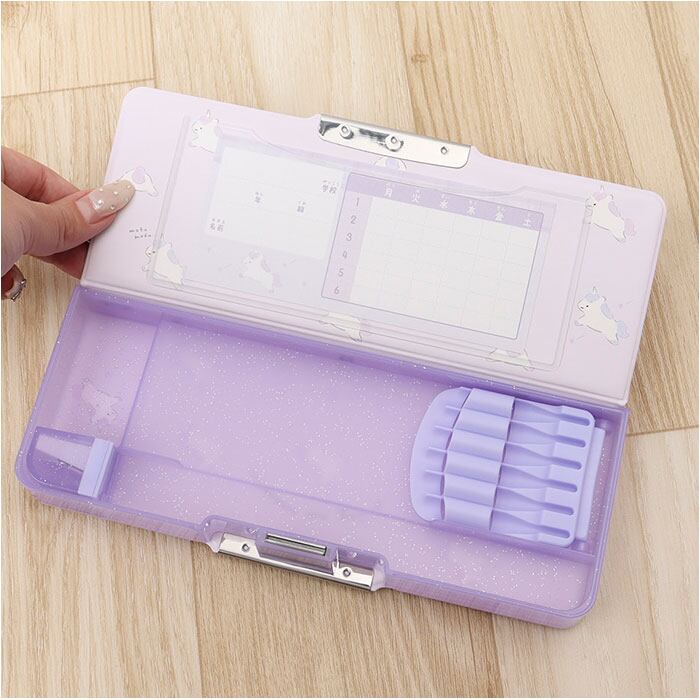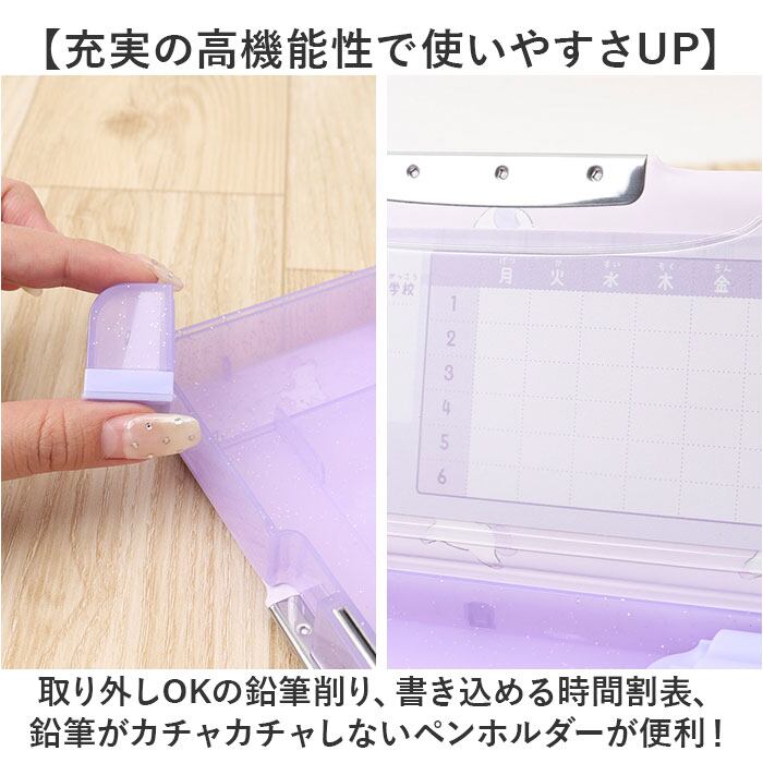 ・取り外しOKの鉛筆削り、書き込める時間割表、鉛筆がカチャカチャしないペンホルダーが便利!