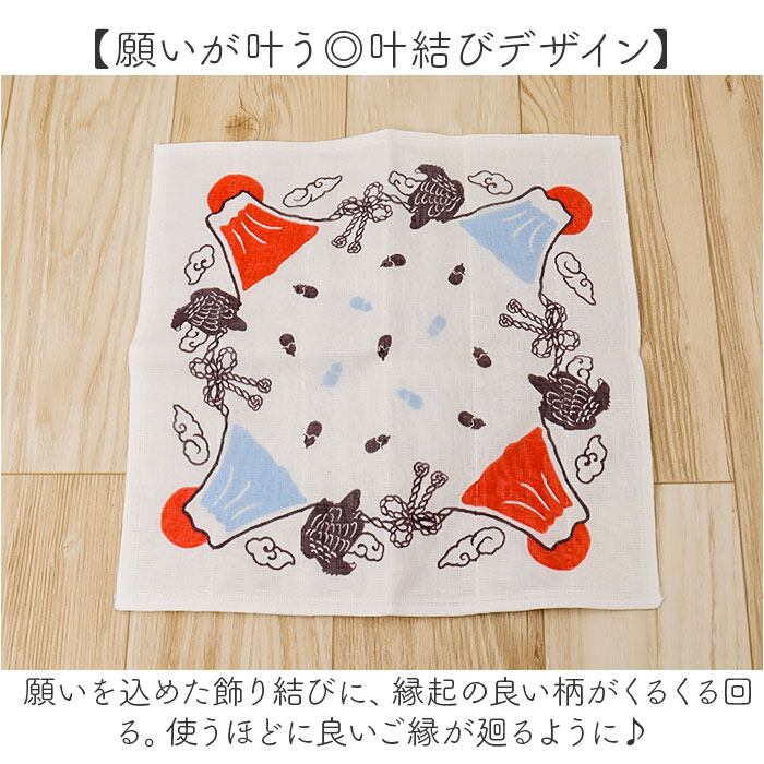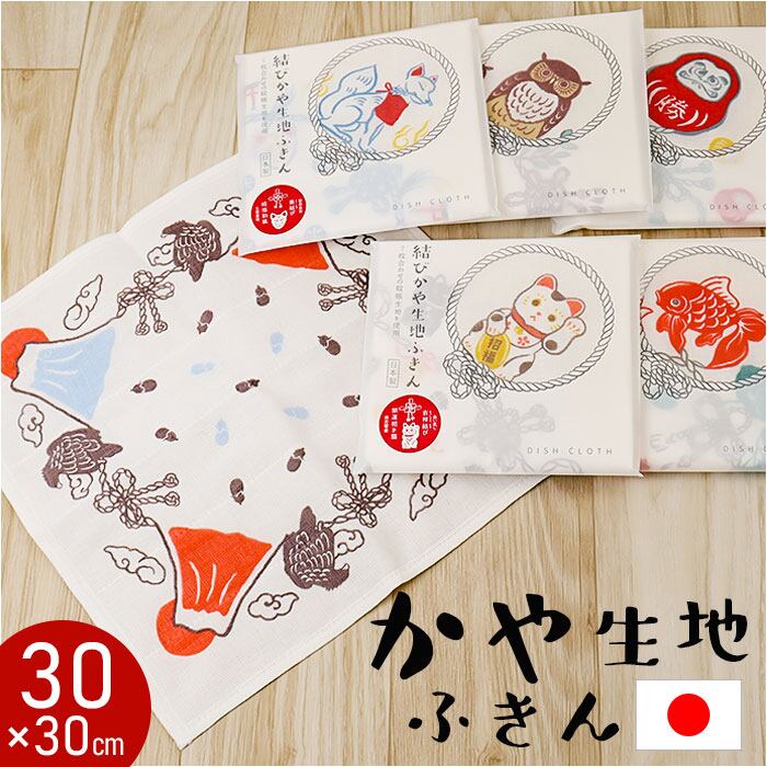 ・日本らしさを感じる、縁起の良い絵柄を可愛く表現。贈り物に最適な「結び かや生地ふきん」。