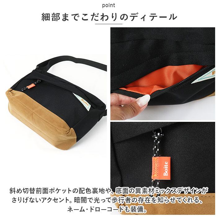 ・斜め切替前面ポケットの配色裏地や、底面の異素材ミックスデザインがさりげないアクセント。暗闇で光って歩行者の存在を知らせてくれる、ネーム・ドローコードも装備。