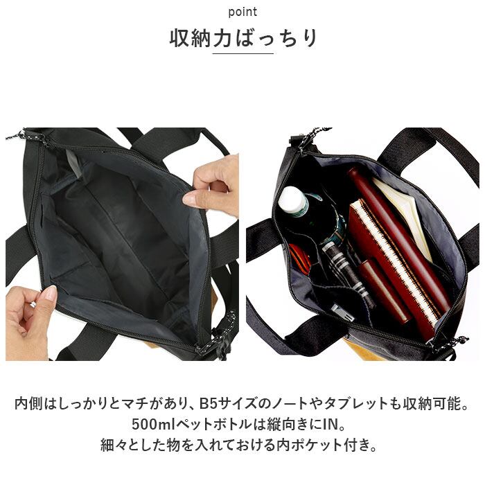 ・内側はしっかりとマチがあり、B5サイズのノートやタブレットも収納可能。500mlペットボトルは縦向きにIN。細々とした物を入れておける内ポケット付き。
