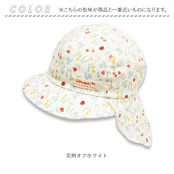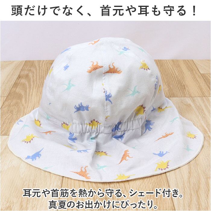 ・耳元や首筋を熱から守る、シェード付き。真夏のお出かけにぴったり。