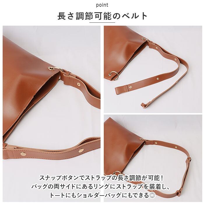 ・スナップボタンでストラップの長さ調節が可能!バッグの両サイドにあるリングにストラップを装着し、トートにもショルダーバッグにもできる◎