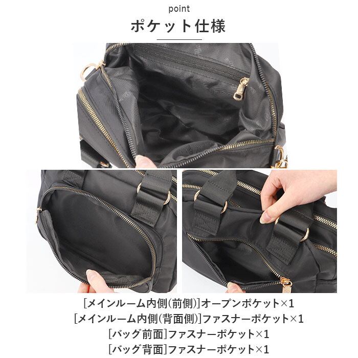 ・ナイロンファブリックのほのかな光沢感と、ゴールドカラーの金具がファッションに華やぎを添える、シンプルながらも女子力高めのデザイン。