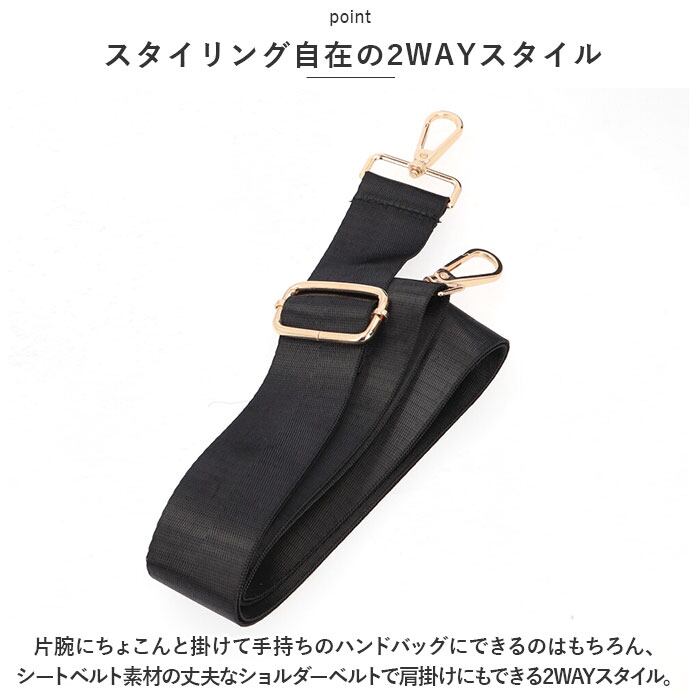 ・片腕にちょこんと掛けて手持ちのハンドバッグにできるのはもちろん、シートベルト素材の丈夫なショルダーベルトで肩掛けにもできる2WAYスタイル。