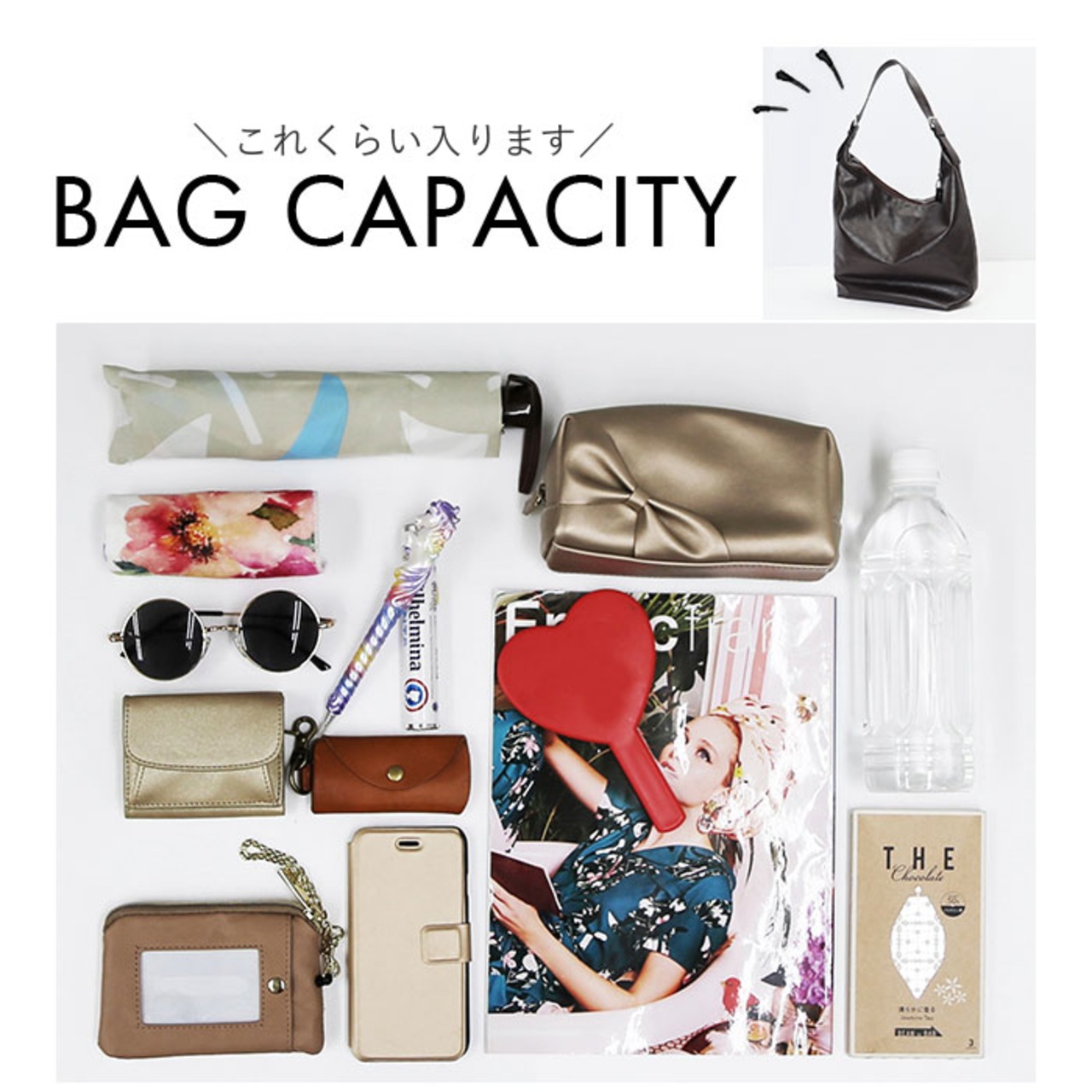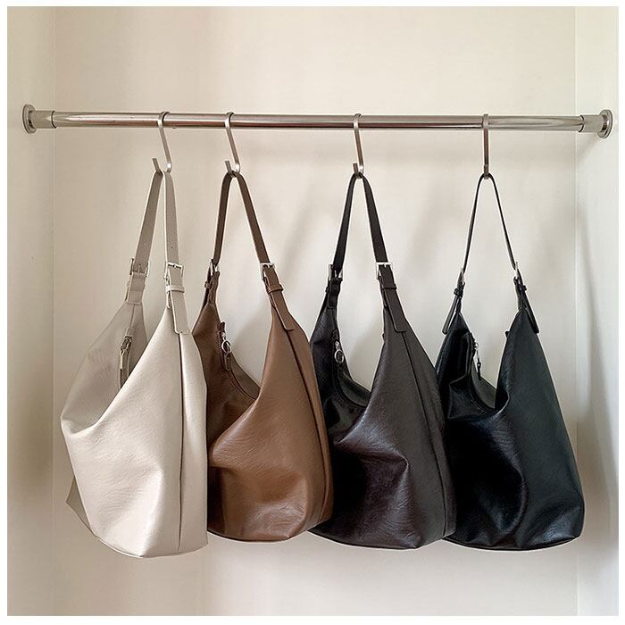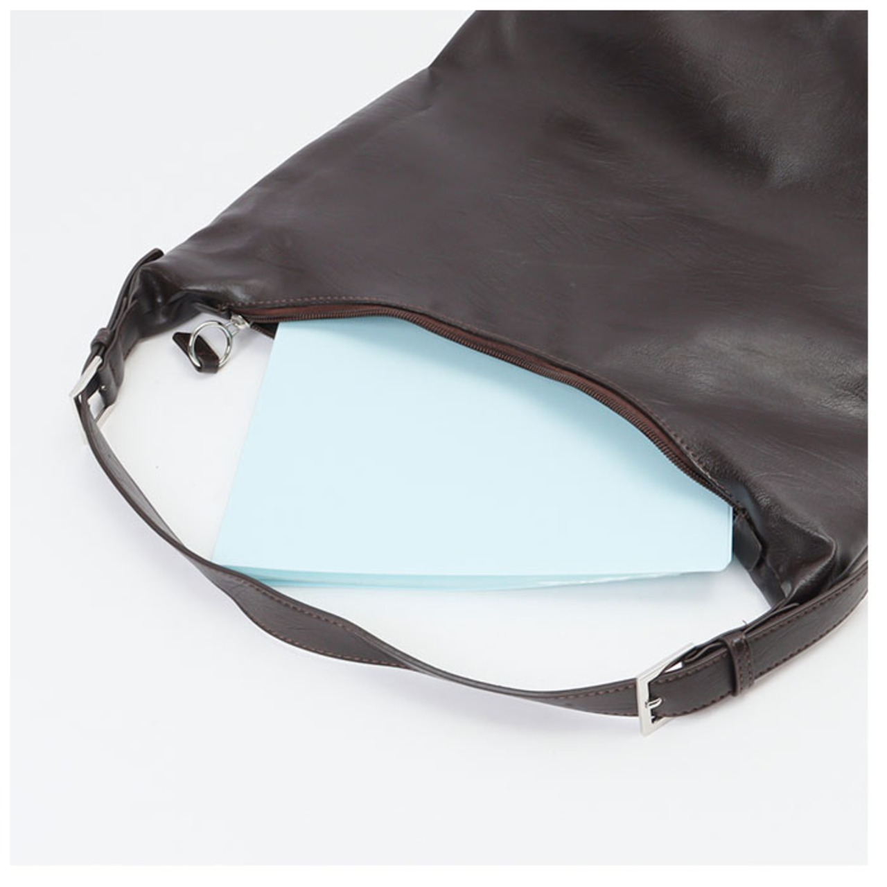 ・バッグのボディもショルダーも軽量なフェイクレザーで仕上げてあるので、ふわっと肩に優しい掛け心地。ショルダーは両サイドのバックルで長さ調節が可能。