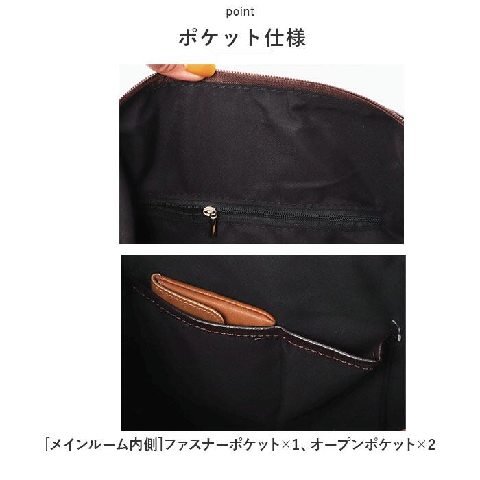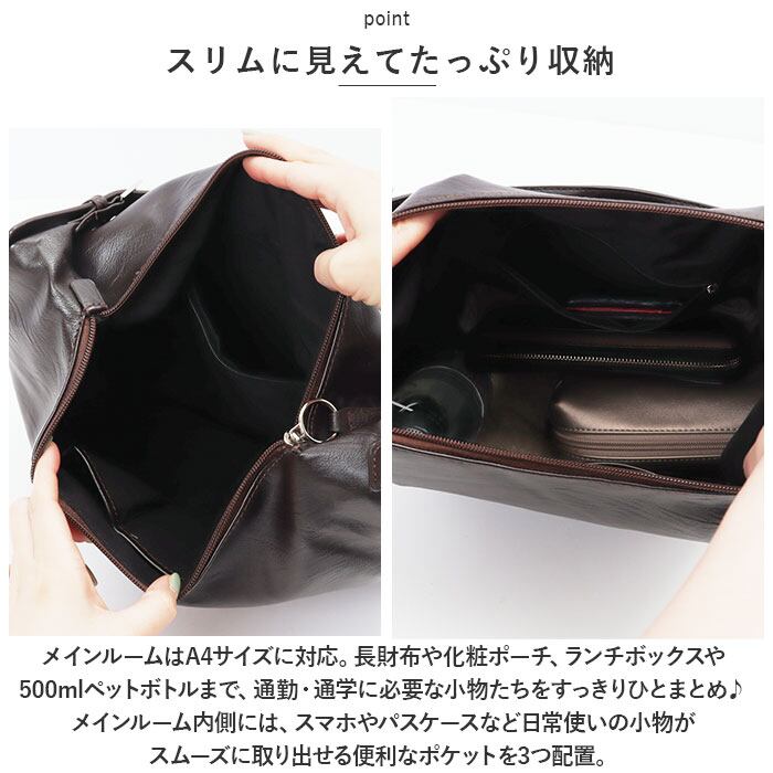 ・メインルームはA4サイズに対応。長財布や化粧ポーチ、ランチボックスや500mlペットボトルまで、通勤・通学に必要な小物たちをすっきりひとまとめ♪