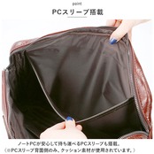 ・メインルーム内側に3つの収納ポケットを設けたほか、ノートPCが安心して持ち運べるPCスリーブも搭載。(※PCスリーブ背面側のみ、クッション素材が使用されています。)