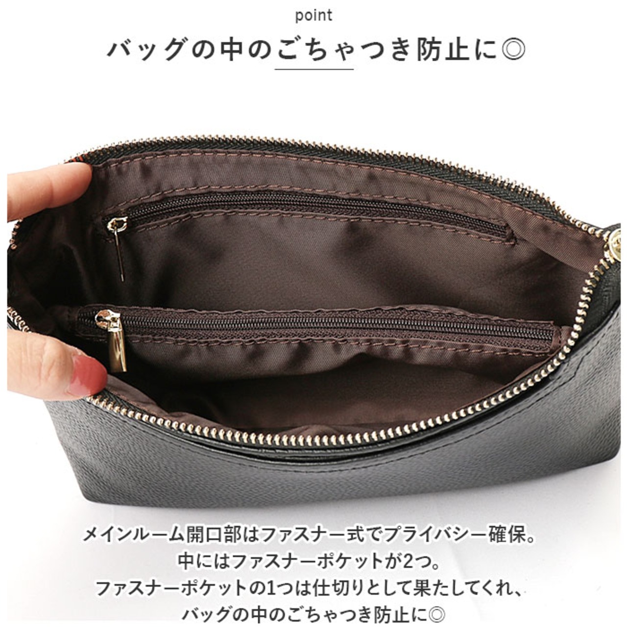 ・メインルーム開口部はファスナー式でプライバシー確保。中にはファスナーポケットが2つ。ファスナーポケットの1つは仕切りとして果たしてくれ、バッグの中のごちゃつき防止に◎