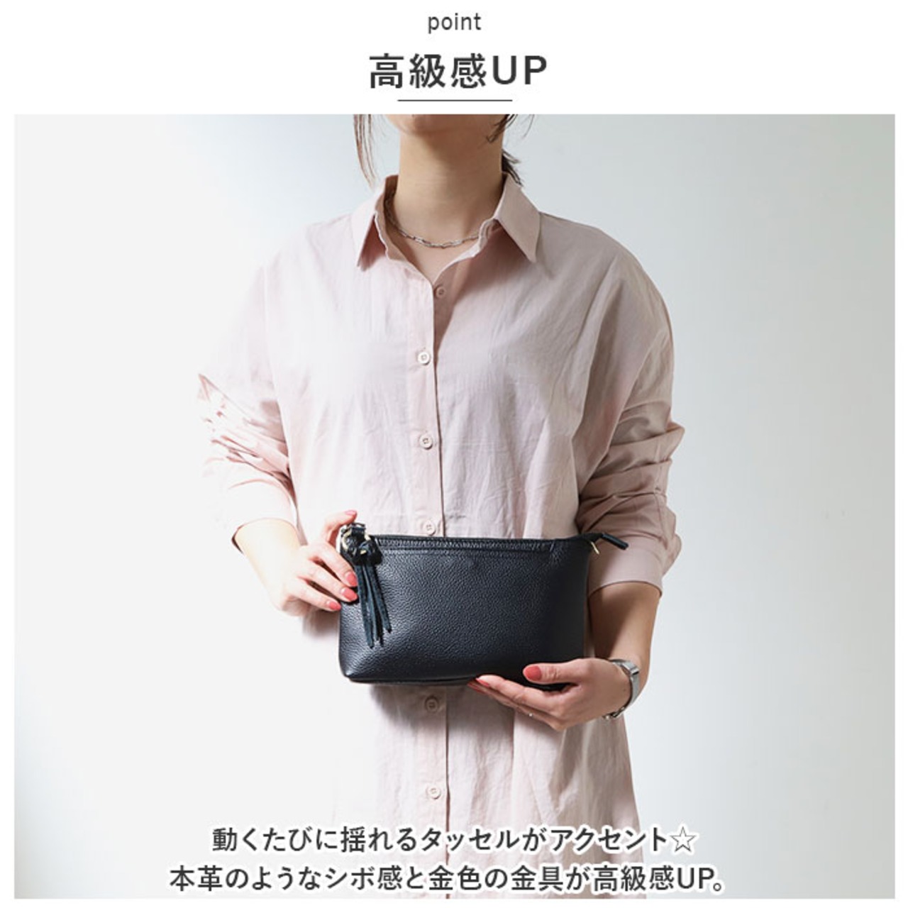 ・動くたびに揺れるタッセルがアクセント☆本革のようなシボ感と金色の金具が高級感UP。