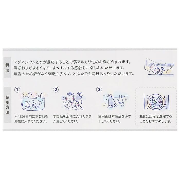 ・マグネシウムが水と反応することで、湯ざわりのまるい弱アルカリ性のお湯がうまれ、いつものお風呂でしっとりすべすべ感触が楽しめる♪