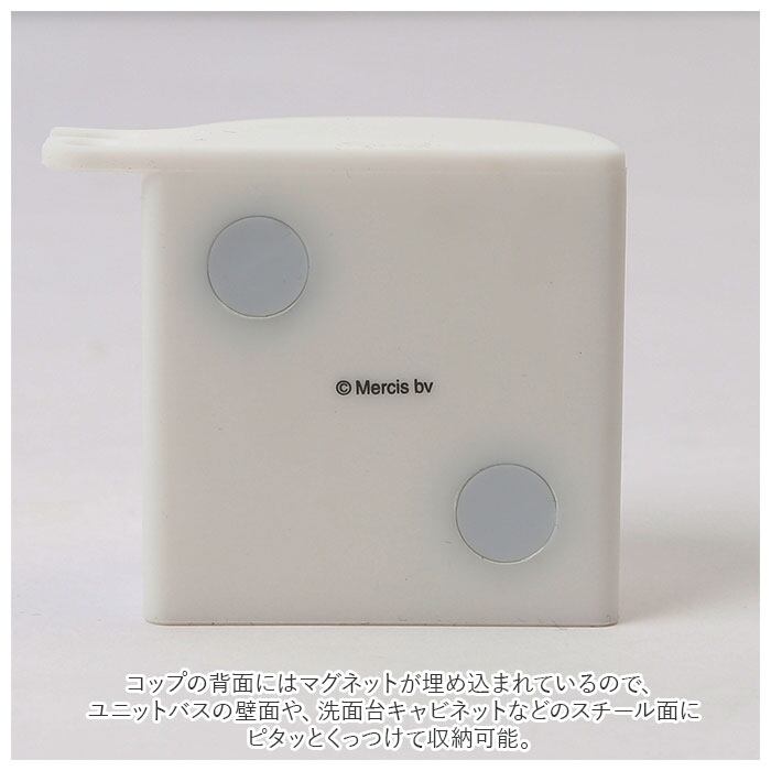 ・コップの背面にはマグネットが埋め込まれているので、ユニットバスの壁面や、洗面台キャビネットなどのスチール面にピタッとくっつけて収納可能。