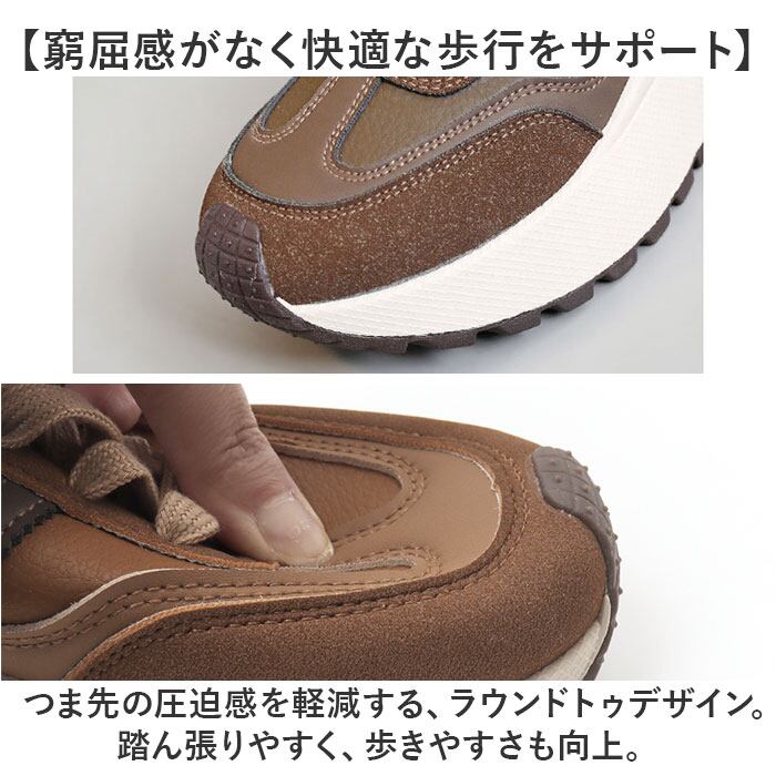 ・つま先の圧迫感を軽減する、ラウンドトゥデザイン。踏ん張りやすく、歩きやすさも向上。