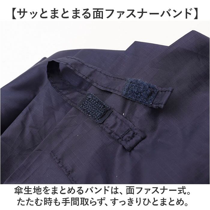 ・傘生地をまとめるバンドは、面ファスナー式。たたむ時も手間取らず、すっきりひとまとめ。
