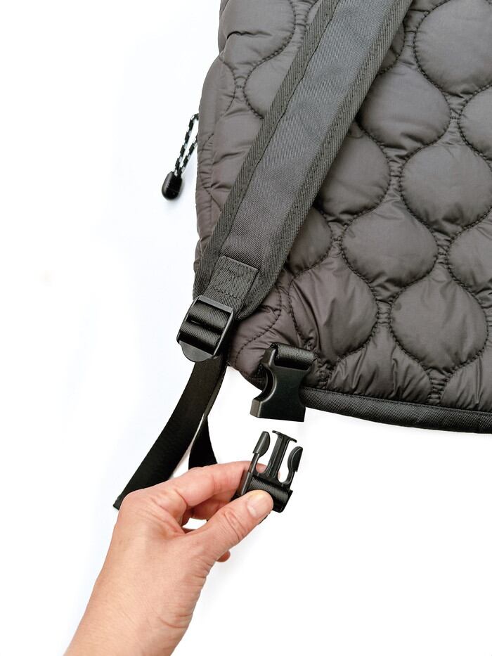 ・プラホック開閉。ふっくら大きめの前面ポケットは、ボトルや折り畳み傘が立てて入れておけます。