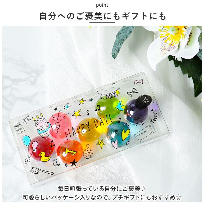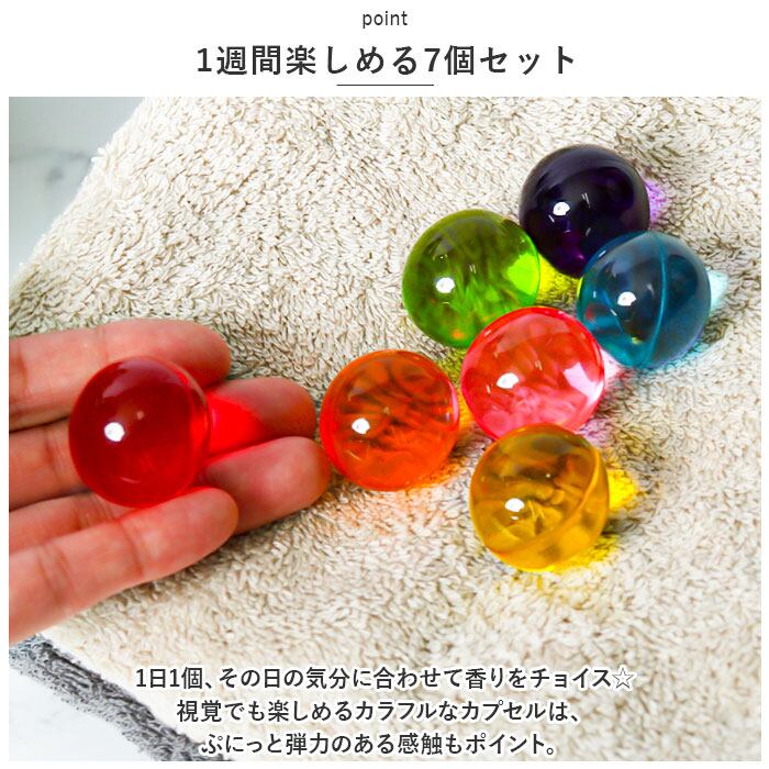 ・1日1個、その日の気分に合わせて香りをチョイス☆視覚でも楽しめるカラフルなカプセルは、ぷにっと弾力のある感触もポイント。