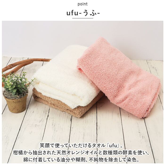 ・笑顔で使っていただけるタオル「ufu」。柑橘から抽出された天然オレンジオイルと数種類の酵素を使い、綿に付着している油分や糊剤、不純物を除去して染色。