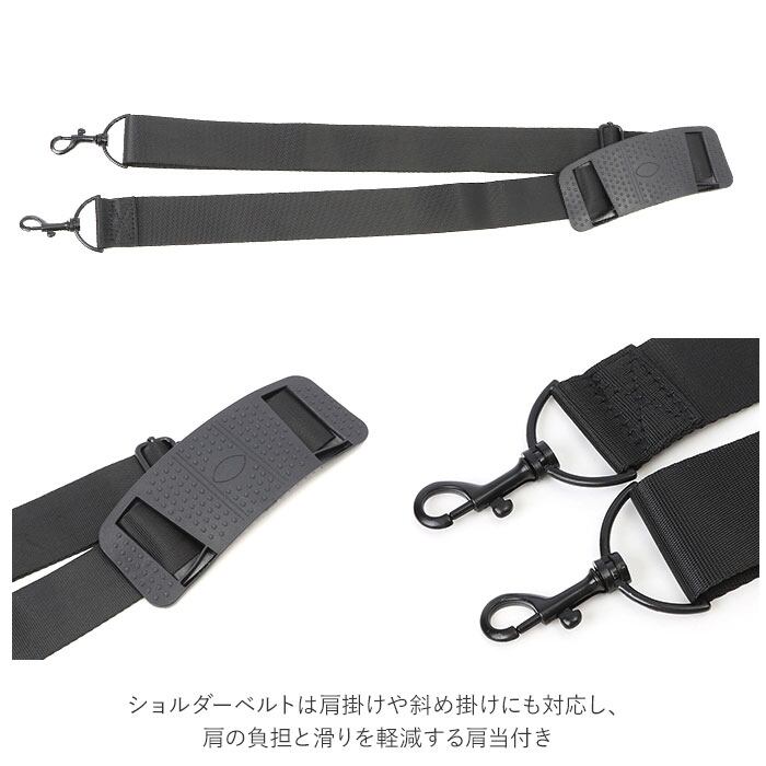 ・ショルダーベルトは肩掛けや斜め掛けにも対応し、肩の負担と滑りを軽減する肩当付き。