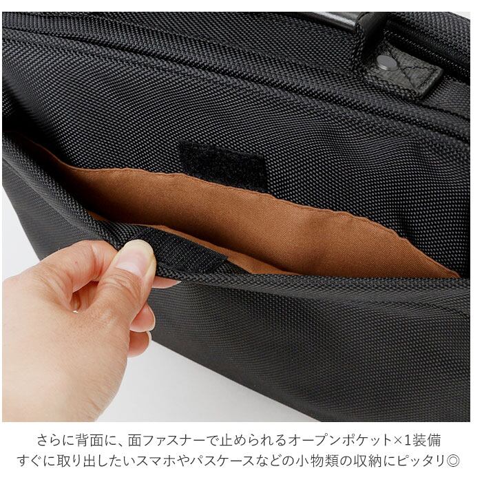 ・フロントのファスナーポケットの中にオープンポケット×1、ペン挿し×1があり、さらに背面には面ファスナーで止められるオープンポケット×1装備。すぐに取り出したいスマホやパスケースなどの小物類の収納にピッタリ◎