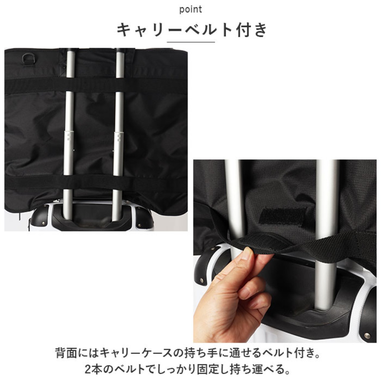 ・背面にはキャリーケースの持ち手に通せるベルト付き。2本のベルトでしっかり固定し持ち運べる。