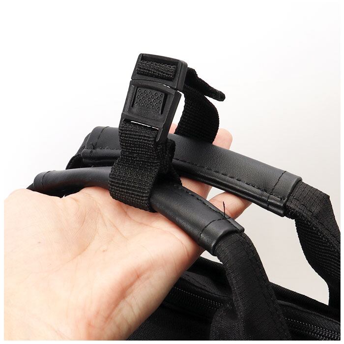・取っ手にはキャリーハンドルに固定するベルトを完備。