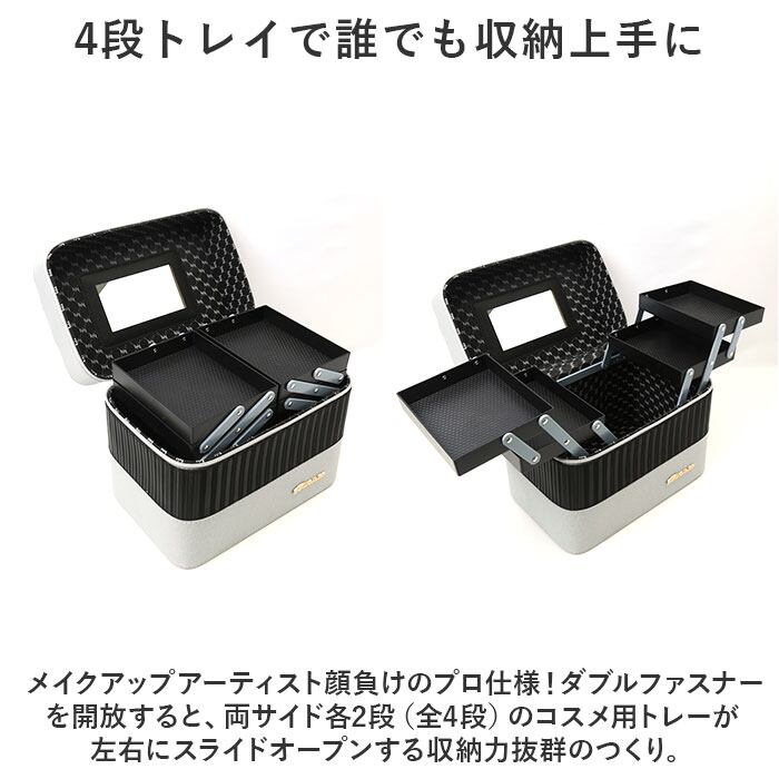 ・メイクアップアーティスト顔負けのプロ仕様!ダブルファスナーを開放すると、両サイド各2段(全4段)のコスメ用トレーが左右にスライドオープンする収納力抜群のつくり。