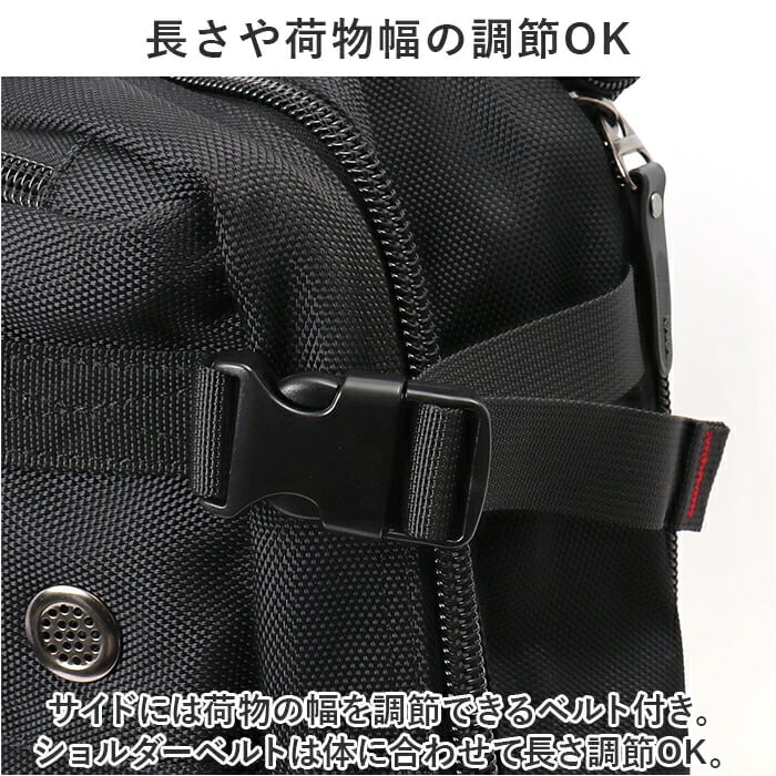 ・サイドには荷物の幅を調節できるベルト付き。ショルダーベルトは体に合わせて長さ調節OK。
