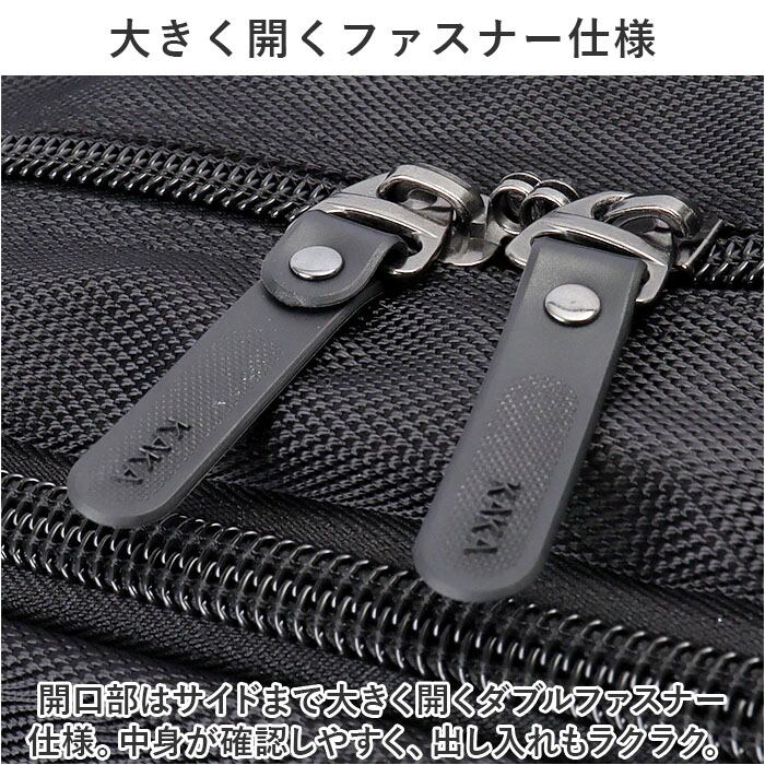 ・開口部はサイドまで大きく開くダブルファスナー仕様。中身が確認しやすく、出し入れもラクラク。