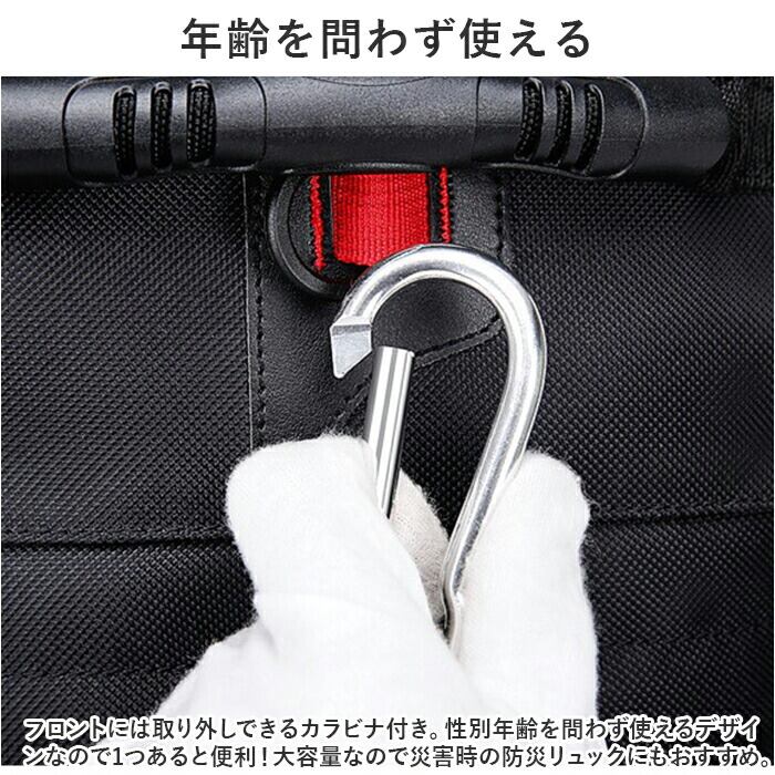 ・フロントには取り外しできるカラビナ付き。性別年齢を問わず使えるデザインなので1つあるととっても便利!大容量なので災害時の防災リュックにもおすすめ。