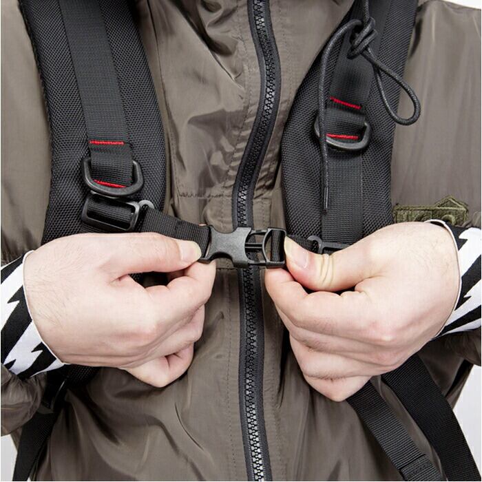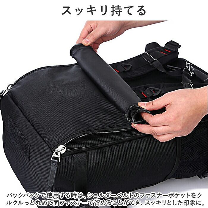 ・バックパックで使用する時は、ショルダーベルト部分のファスナーポケットをクルクルっと丸めて面ファスナーで留めることができ、スッキリとした印象に。