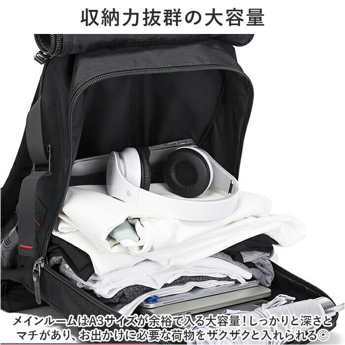 ・メインルームはA3サイズが余裕で入る大容量!しっかりと深さとマチがあり、お出かけに必要な荷物をザクザクと入れられる◎