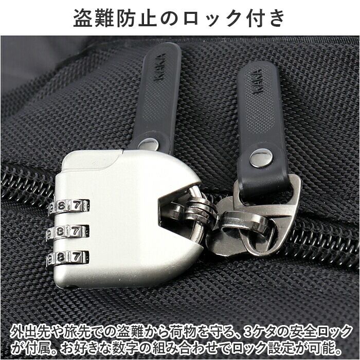・外出先や旅先での盗難から荷物を守る、3ケタの安全ロックが付属。お好きな数字の組み合わせでロック設定が可能。