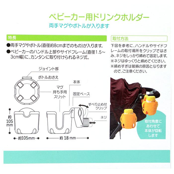 ・ベビーカーのハンドル上部、サイドフレーム(直径1.5~3cm幅)に、ネジで簡単取り付け◎(※ベビーカーの種類によっては取り付けできない場合があります。)