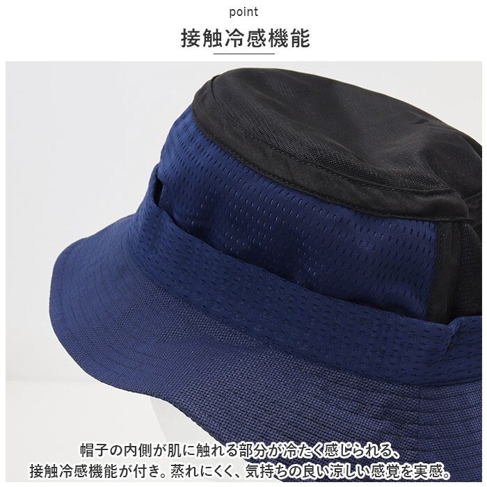 ・帽子の内側が肌に触れる部分が冷たく感じられる、接触冷感機能が付き。蒸れにくく、気持ちの良い涼しい感覚を実感。