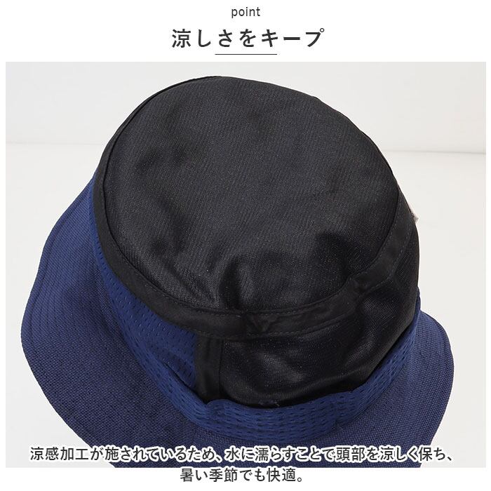 ・涼感加工が施されているため、水に濡らすことで頭部を涼しく保ち、暑い季節でも快適。