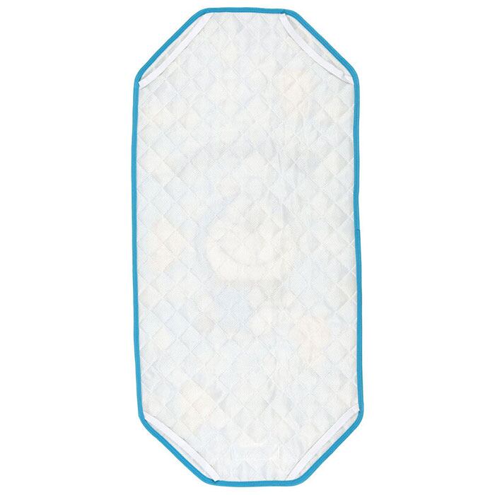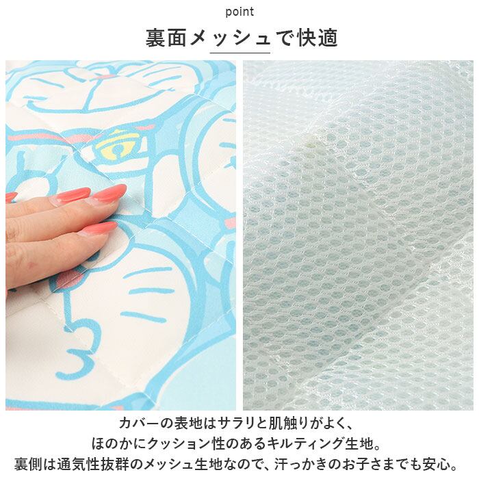 ・カバーの表地はサラリと肌触りがよく、ほのかにクッション性のあるキルティング生地。裏側は通気性抜群のメッシュ生地なので、汗っかきのお子さまでも安心。