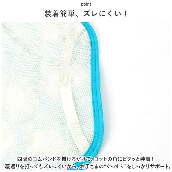 ・四隅のゴムバンドを掛けるだけで、コットの角にピタッと装着!寝返りを打ってもズレにくいから、お子さまの“ぐっすり”をしっかりサポート。