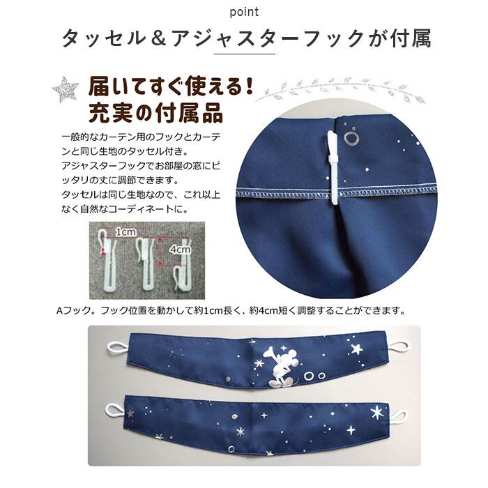 ・カーテンを開けるときに、サッとまとめられるタッセル。アジャスターフックを使えば、丈の微調整が可能。