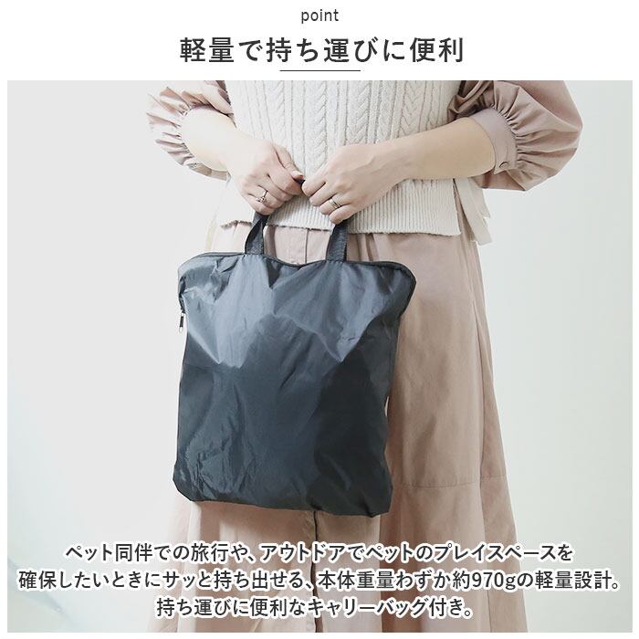 ・ペット同伴での旅行や、アウトドアでペットのプレイスペースを確保したいときにサッと持ち出せる、本体重量わずか約970gの軽量設計。持ち運びに便利なキャリーバッグ付き。