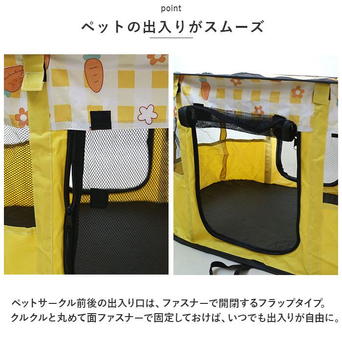 ・ペットサークル前後の出入り口は、ファスナーで開閉するフラップタイプ。クルクルと丸めて面ファスナーで固定しておけば、いつでも出入りが自由に。