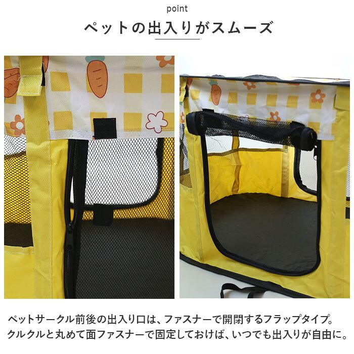 ・ペットサークル前後の出入り口は、ファスナーで開閉するフラップタイプ。クルクルと丸めて面ファスナーで固定しておけば、いつでも出入りが自由に。