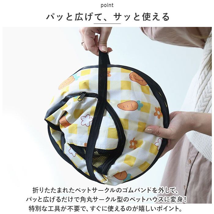 ・折りたたまれたペットサークルのゴムバンドを外して、パッと広げるだけで角丸サークル型のペットハウスに変身!特別な工具が不要で、すぐに使えるのが嬉しいポイント。