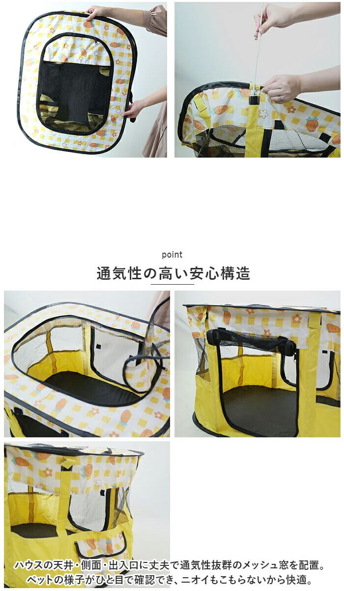 ・ハウスの天井・側面・出入口に丈夫で通気性抜群のメッシュ窓を配置。ペットの様子がひと目で確認でき、ニオイもこもらないから快適。
