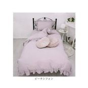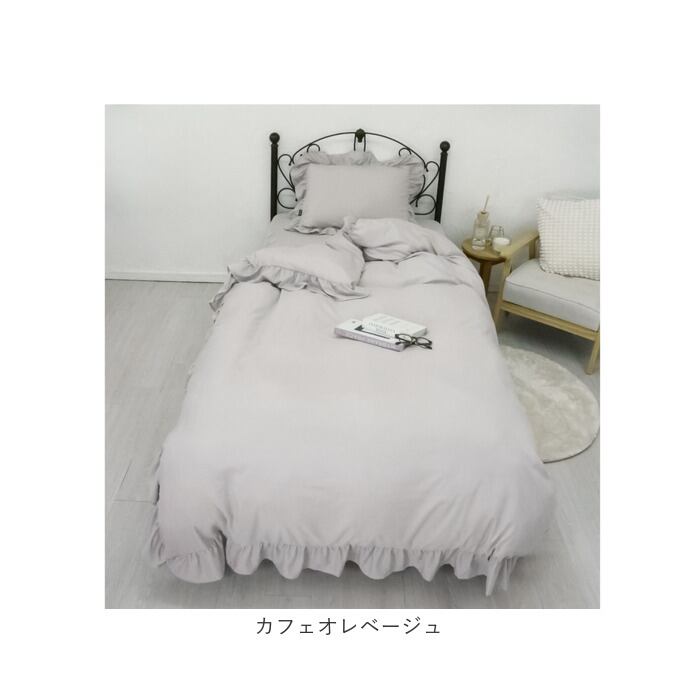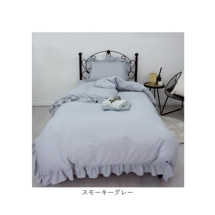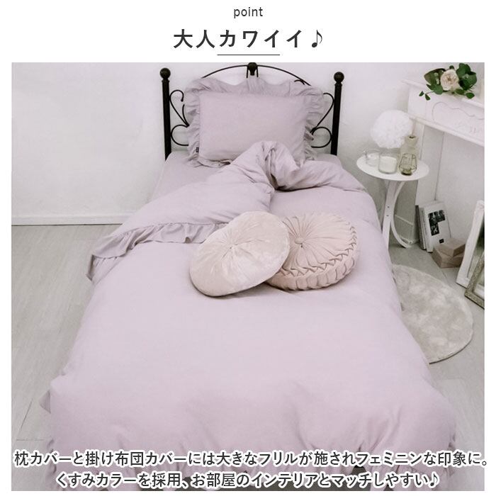・枕カバーと掛け布団カバーには大きなフリルが施されフェミニンな印象に。くすみカラーを採用し、お部屋のインテリアとマッチしやすい大人カワイイ仕上がり♪