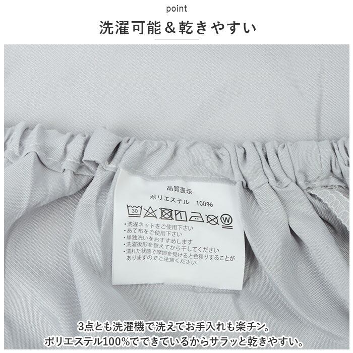・3点とも洗濯機で洗えてお手入れも楽チン。ポリエステル100%でできているからサラッと乾きやすい。