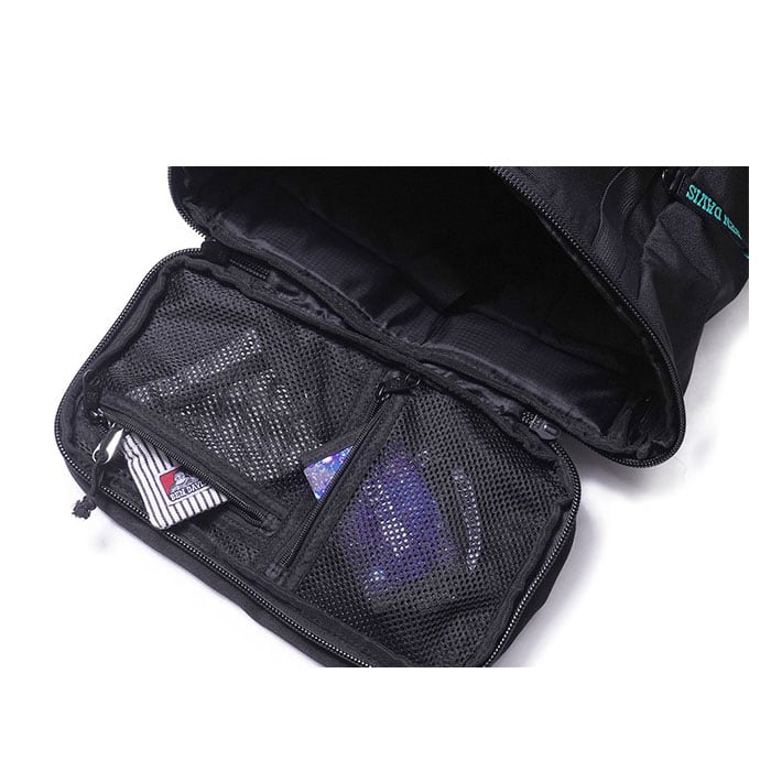 ・メインルーム内側には、小物の仕分けに役立つメッシュファスナーポケット×1に、フラップ裏側にもパスポートなどが見やすく整理できるメッシュファスナーポケット×2を配置。