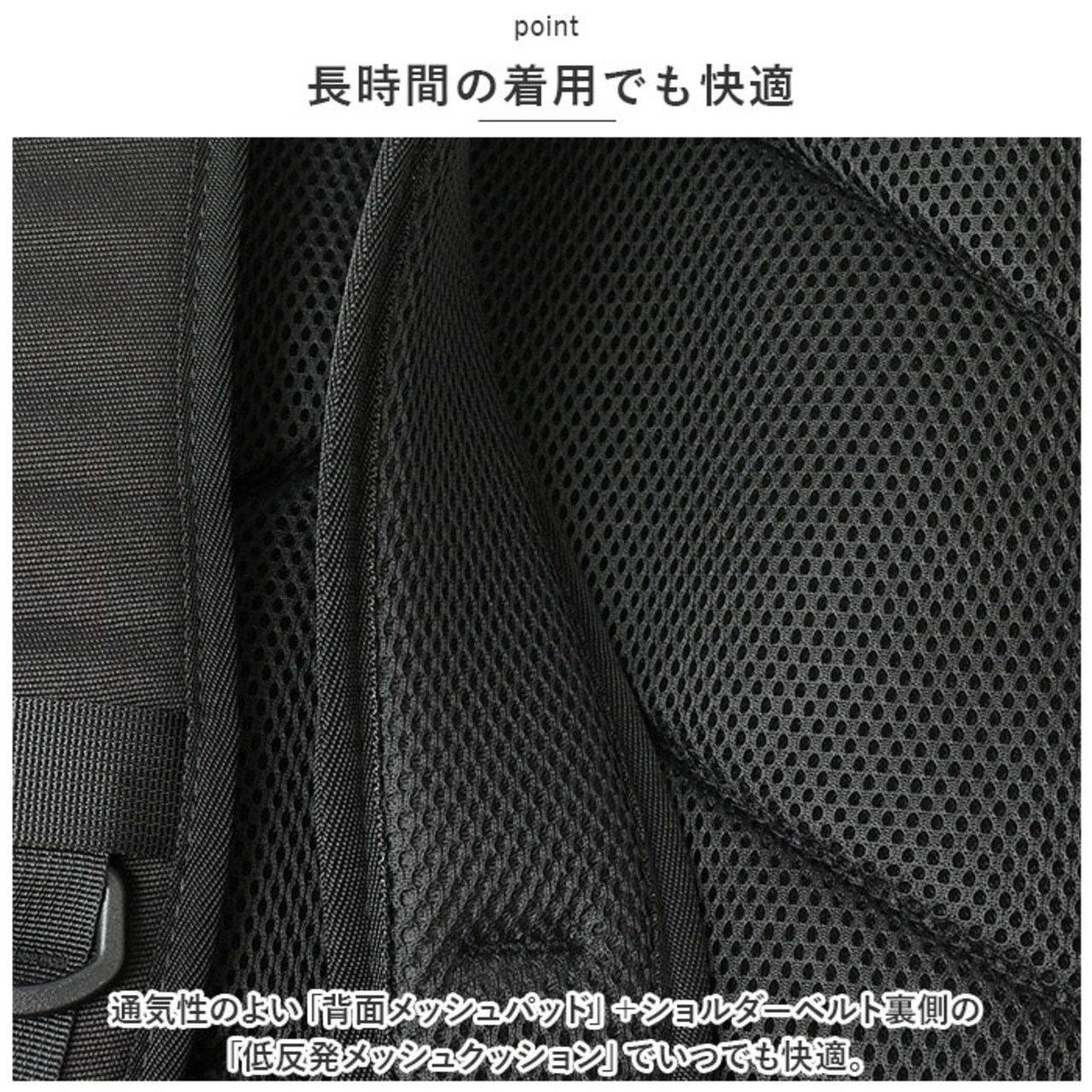 ・通気性のよい「背面メッシュパッド」+ショルダーベルト裏側の「低反発メッシュクッション」でいつでも快適。