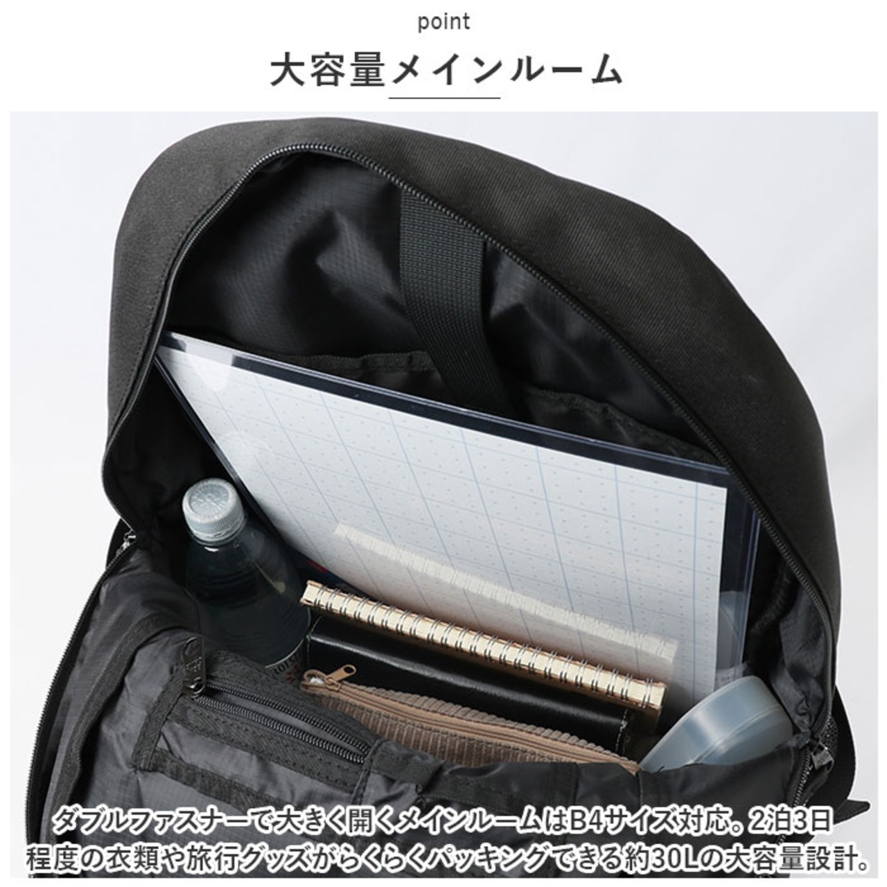 ・ダブルファスナーで大きく開くメインルームはB4サイズ対応。2泊3日程度の衣類や旅行グッズがらくらくパッキングできる約30Lの大容量設計。