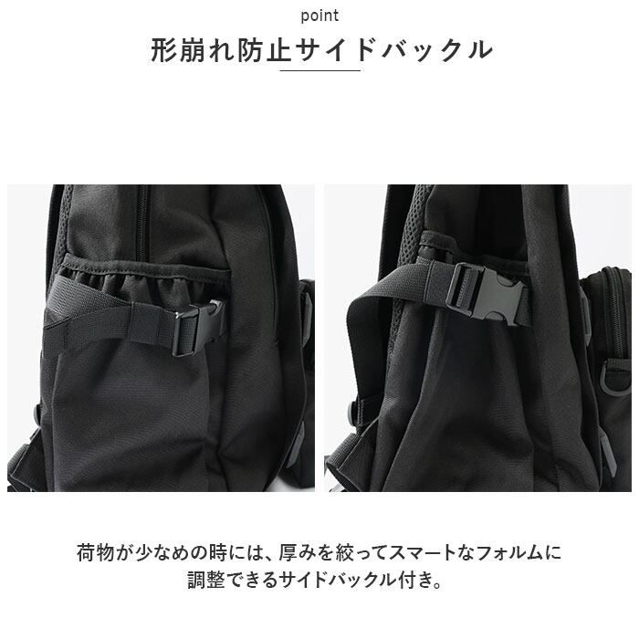 ※荷物が少なめの時には、厚みを絞ってスマートなフォルムに調整できるサイドバックル付き。