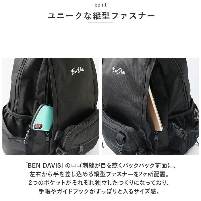・「BEN DAVIS」のロゴ刺繍が目を惹くバックパック前面に、左右から手を差し込める縦型ファスナーを2ヶ所配置。2つのポケットがそれぞれ独立したつくりになっており、手帳やガイドブックがすっぽりと入るサイズ感。
