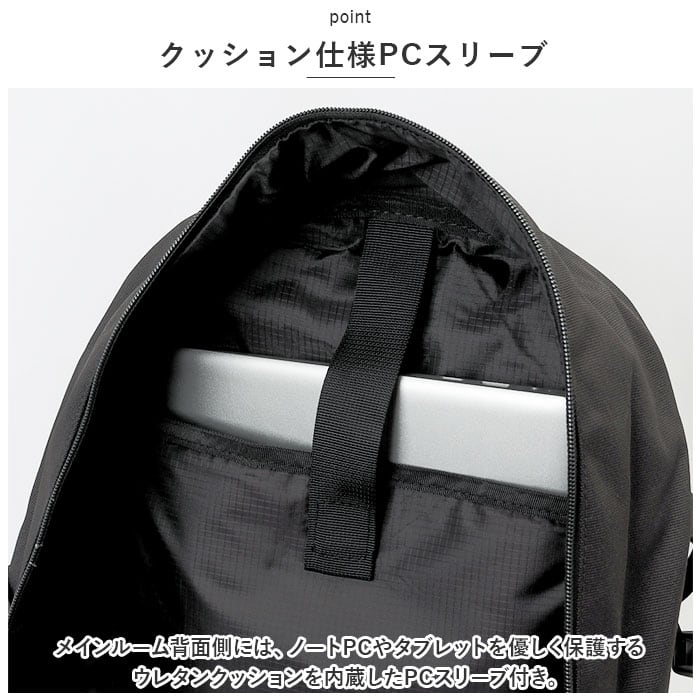 ・メインルーム背面側には、ノートPCやタブレットを優しく保護するウレタンクッションを内蔵したPCスリーブ付き。
